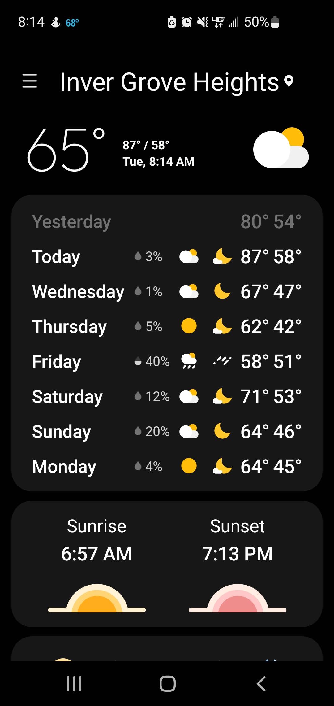 The weekend weather. Looks nice on Saturday 71*F and Sunday a bit cooler. Friday since we might get rain we plan to leave for our mini vacation early Saturday morning. I'll probably just pack the car up Friday after work so it's all ready to go. We are not staying at a Hipcamp since there aren't any in the New Ulm area. Just at the state park, which is cheap, I think $17 per night?? We pay any where from $50 to $30 a night to Hipcamp which is still cheap! We save our money for going out to eat, wineries and breweries or activities.