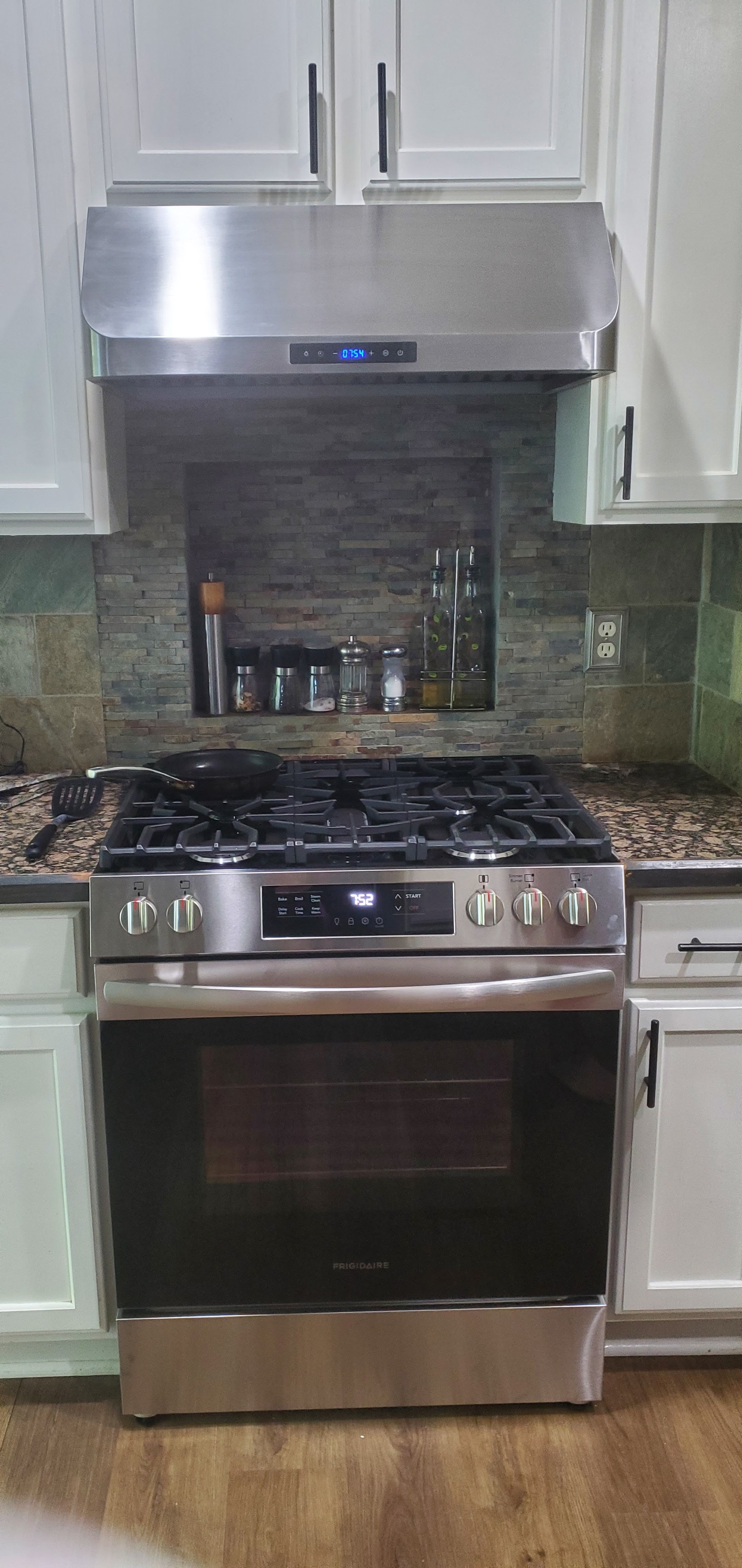 It took quite a while for Steve to install, like all day. He had to remove tile from either side and the back to fit the stove into the space. Then we had gas line hook up connection issues where we had to go to the store 2 times for the right parts. It's finally hooked up and ready to use, but we need to install wood on the back and stain it, plus get some side black pieces for the sides to go over the gap so food doesn't go down the sides. It's a real process that will need to be finished another day! Or maybe today?